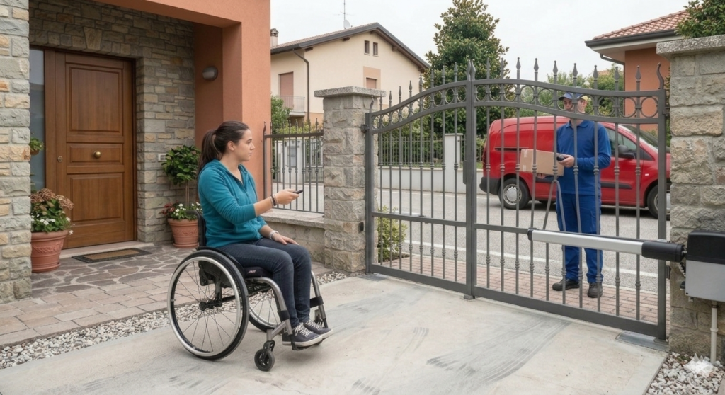 Il primo ostacolo per chi rientra a casa è spesso il cancello. Per una persona con disabilità motoria, dover scendere dall’auto, sbloccare manualmente una serratura e spingere un’anta pesante è spesso impossibile.